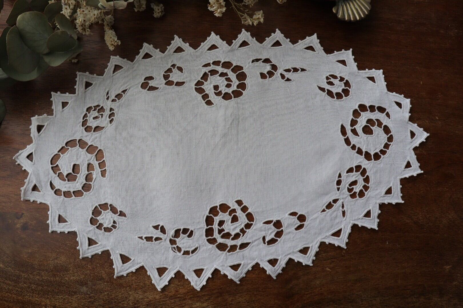 リネン地オーバル型のカットワーク刺繍ドイリー