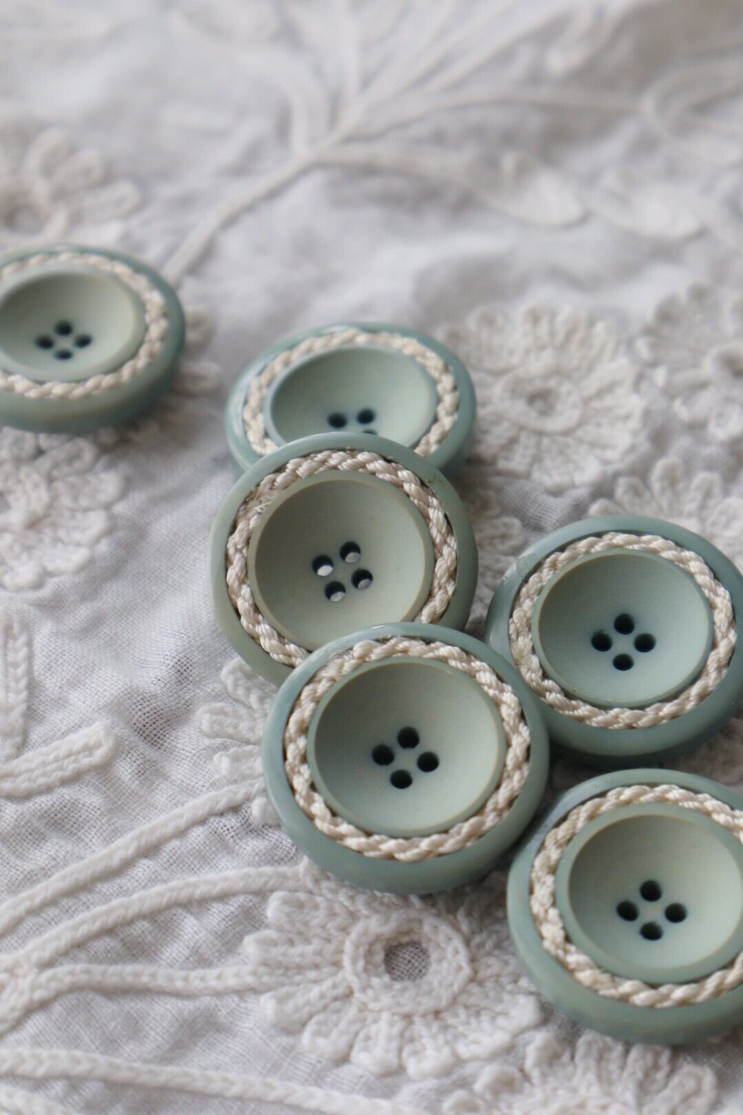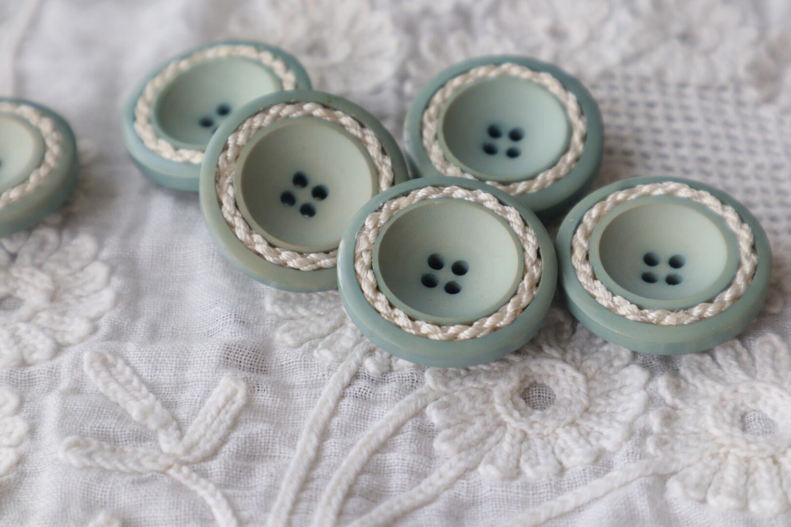 くすみグリーンの柔らかな色みと4つ穴のレトロな雰囲気です。