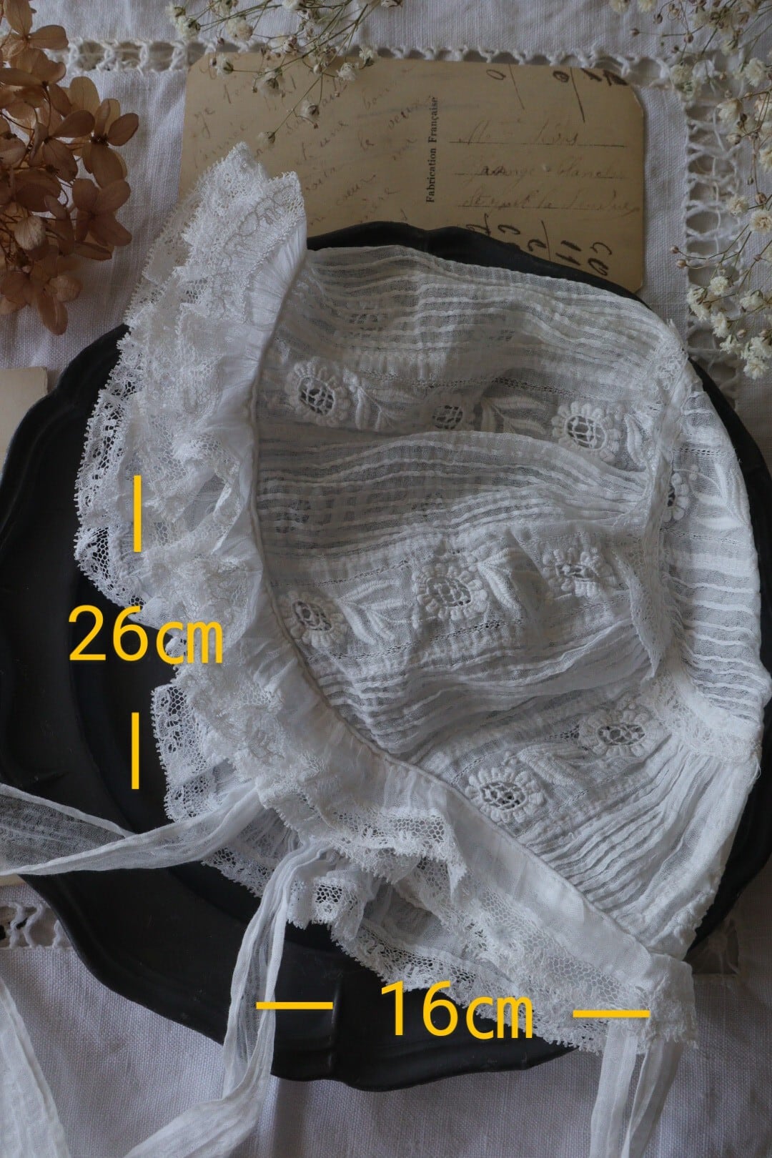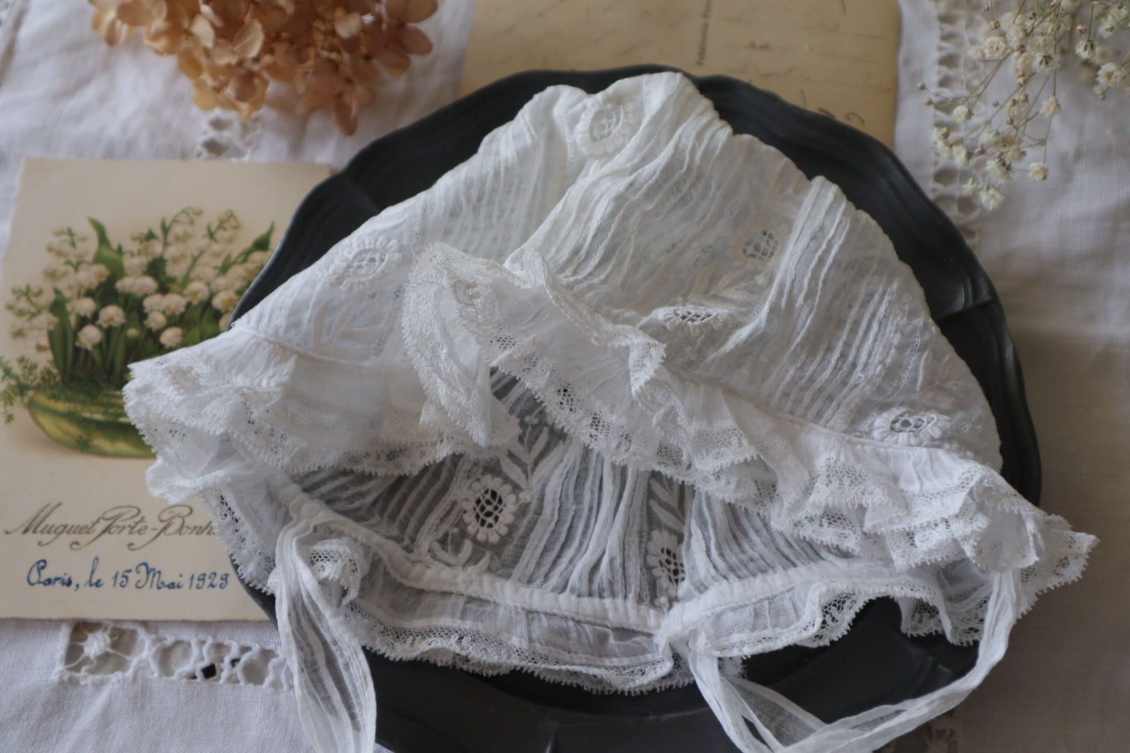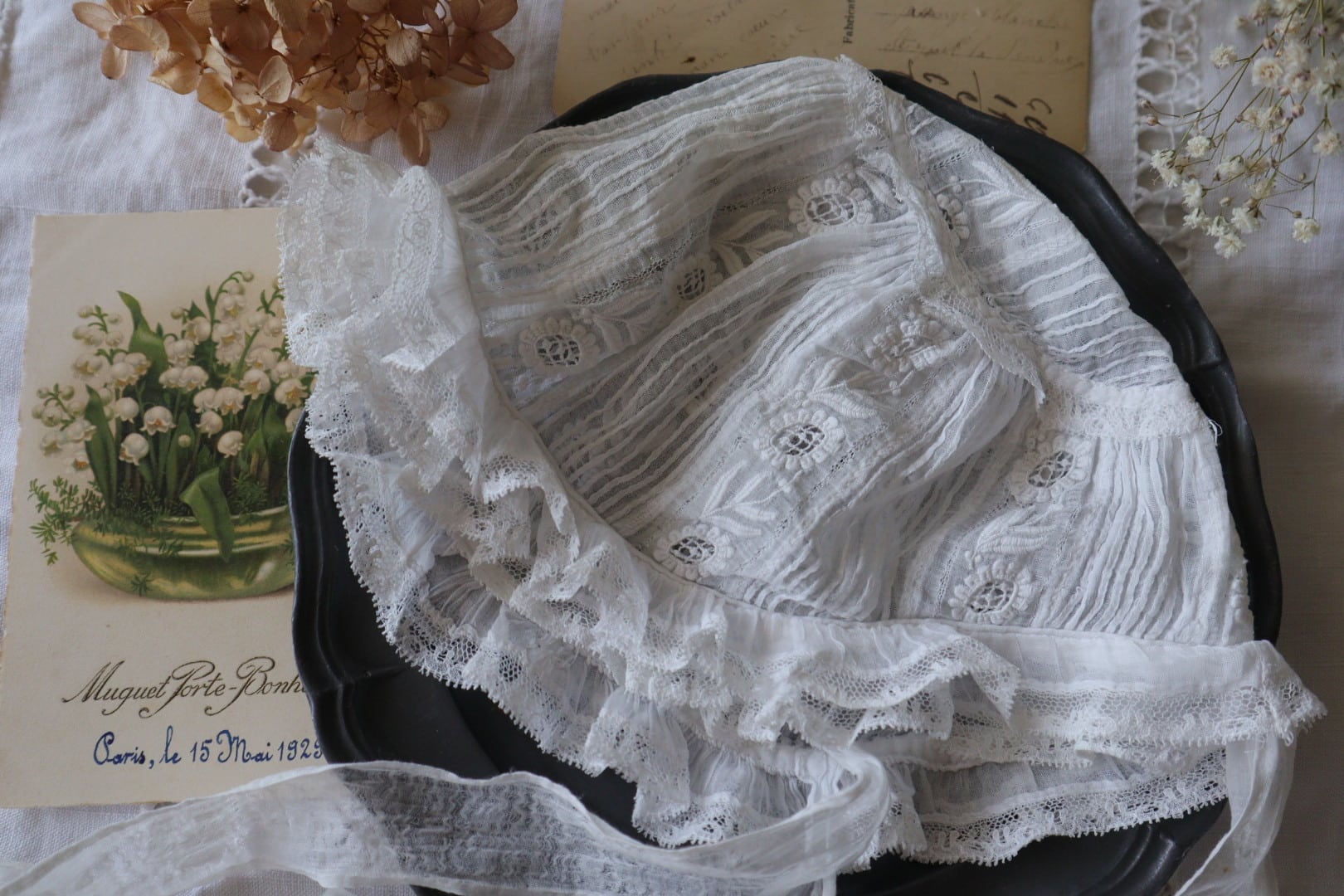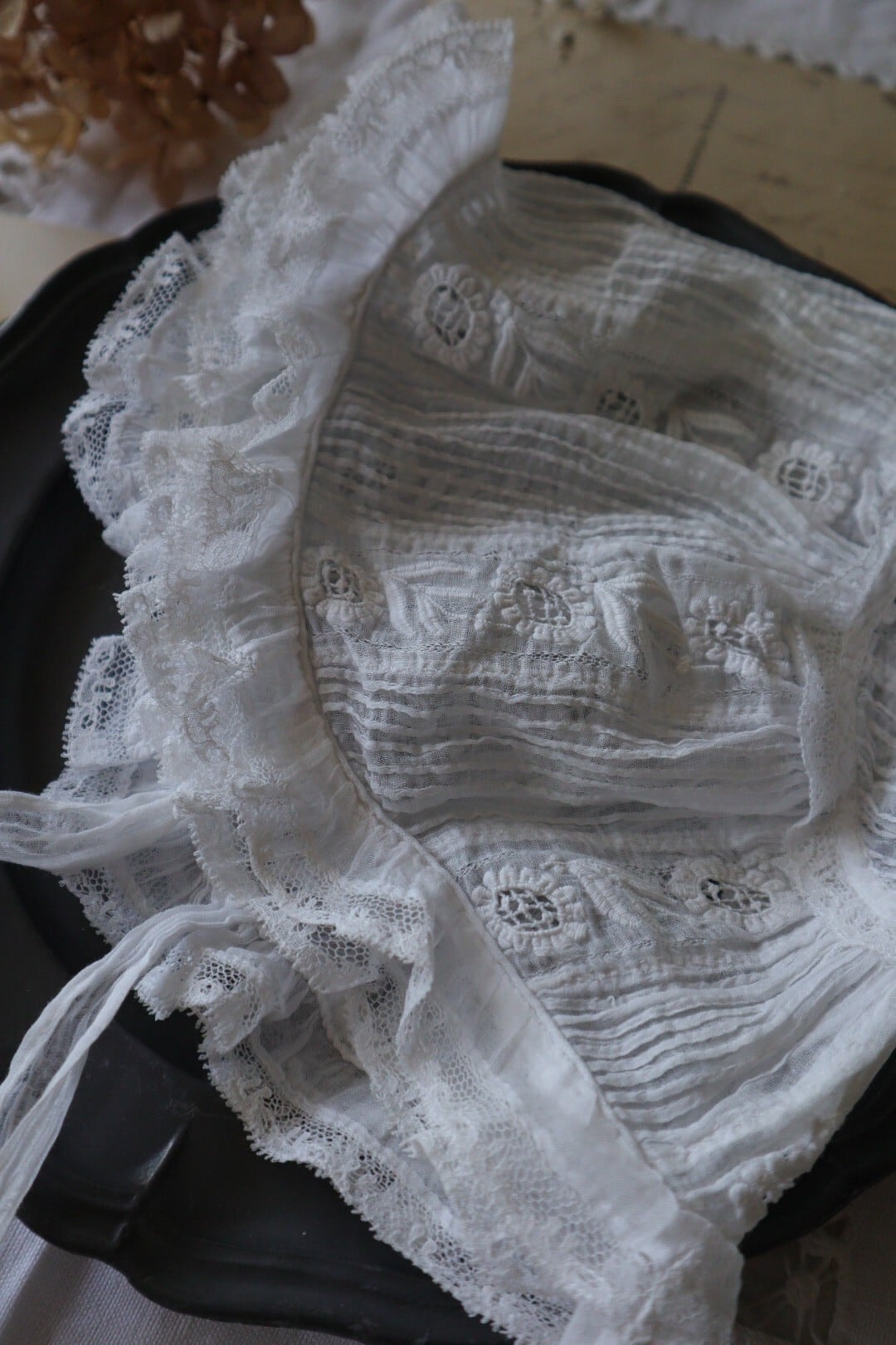古いレースですので、小さな穴や茶シミがある場合がございます。アンティークの風合いと含めてお楽しみ頂ければ嬉しいです。