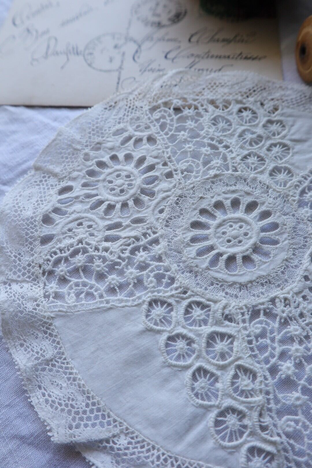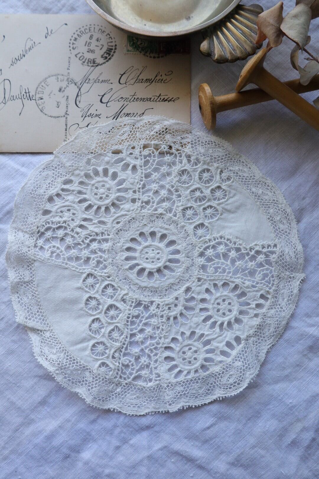 France製 アンティークカットワーク刺繍レースドイリー ホワイト
