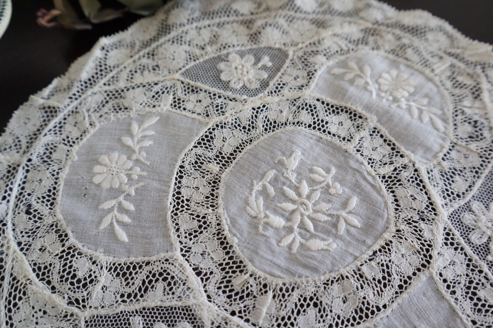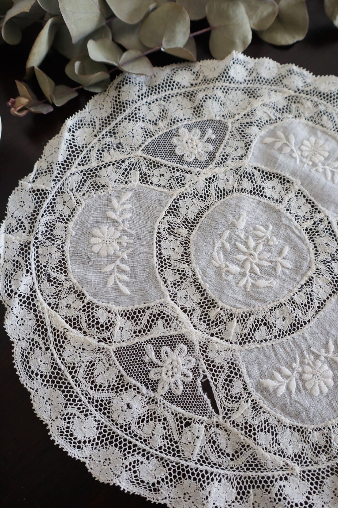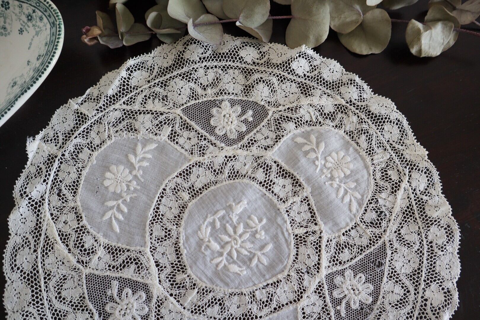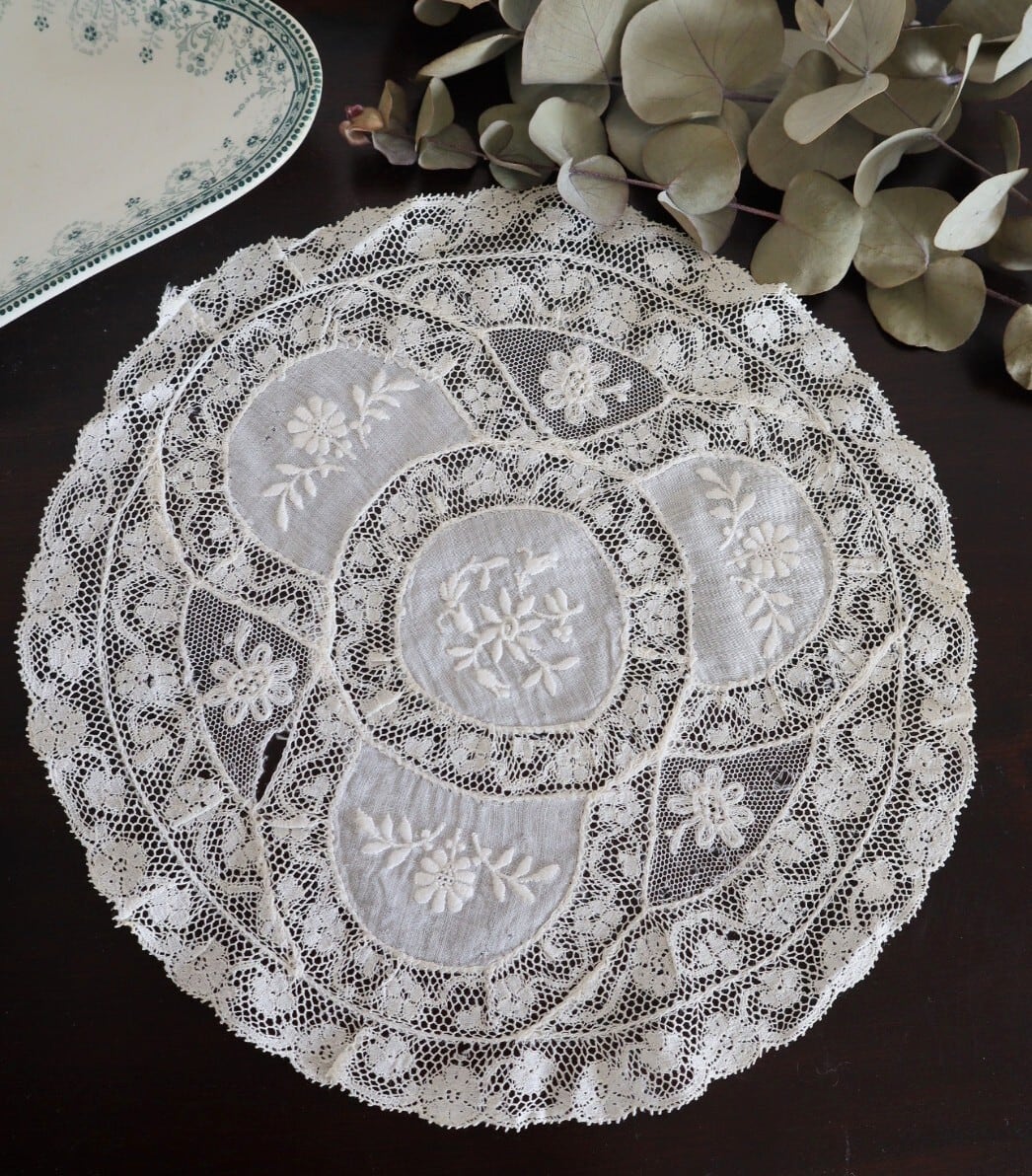 ボビンレースと手刺繍レースを組み合わせて丸型に整えたドイリーです。