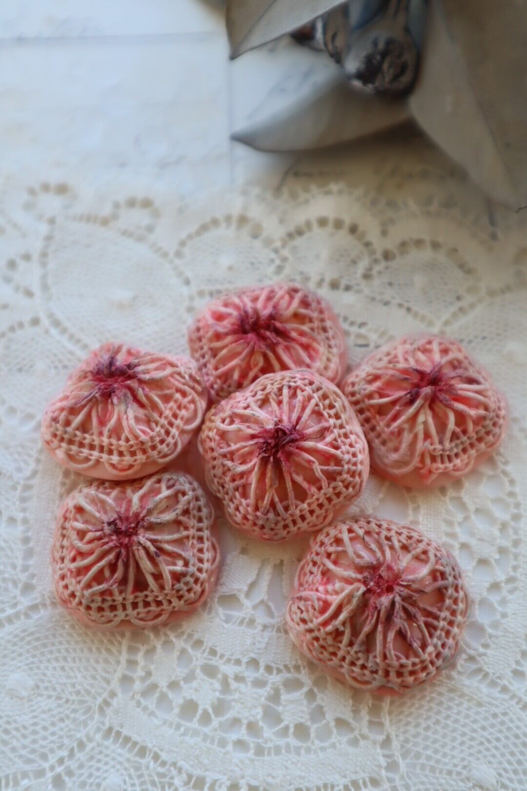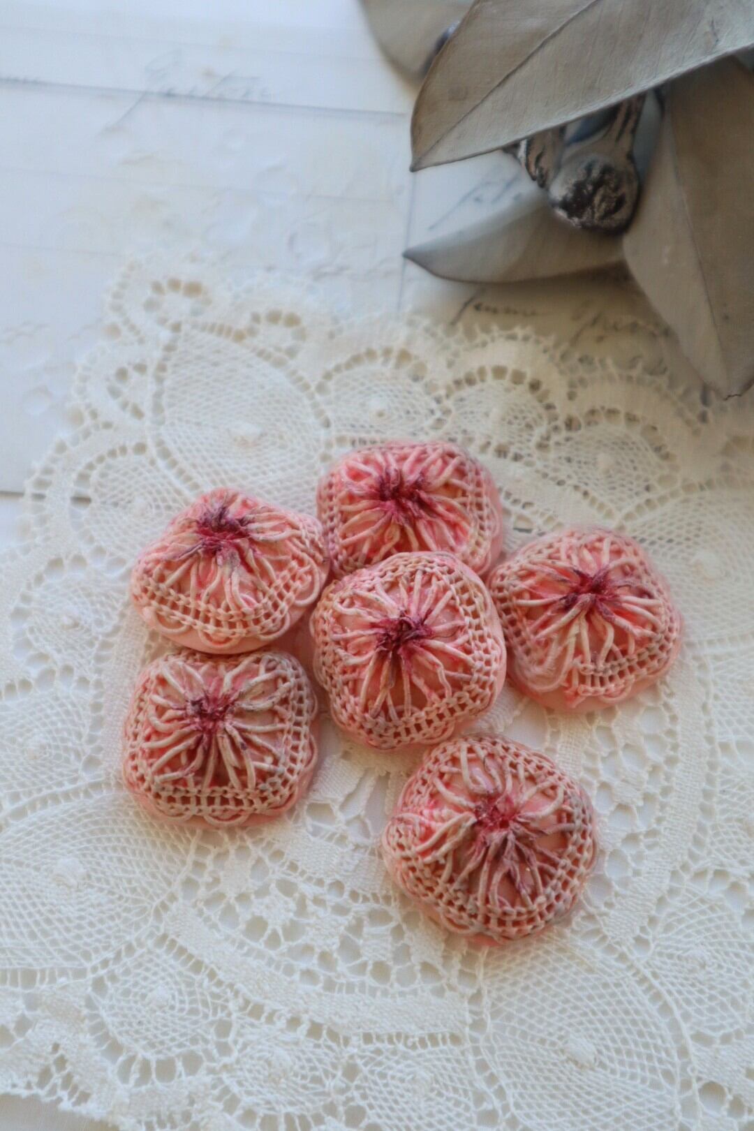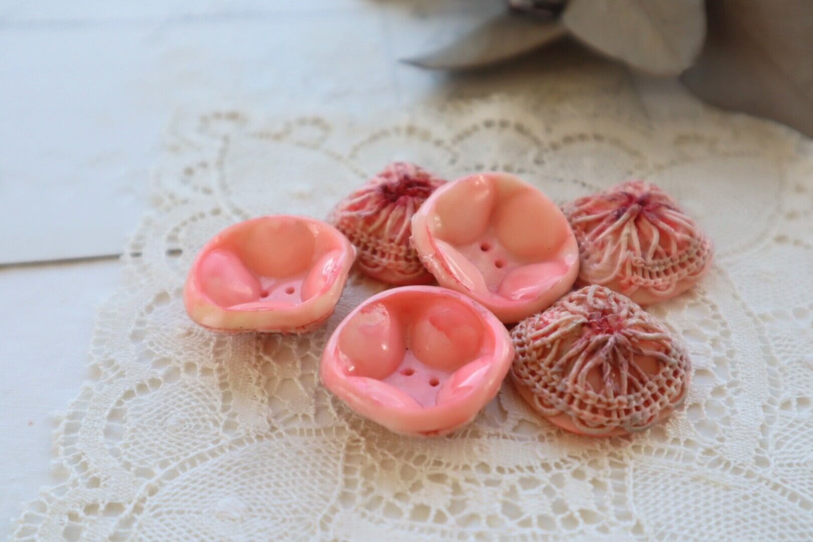プラスティック製の台座にモチーフレースの飾りのあるボタン