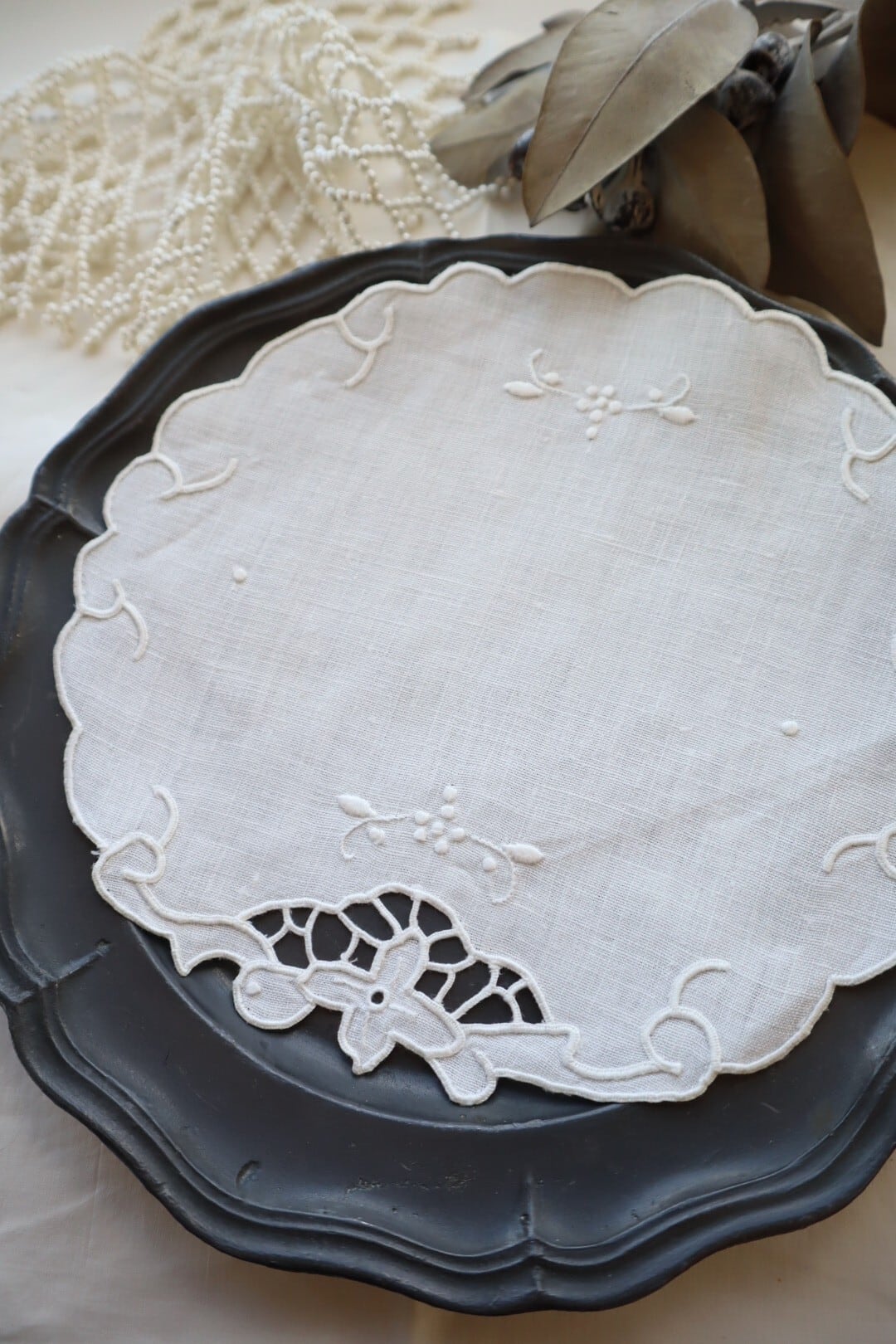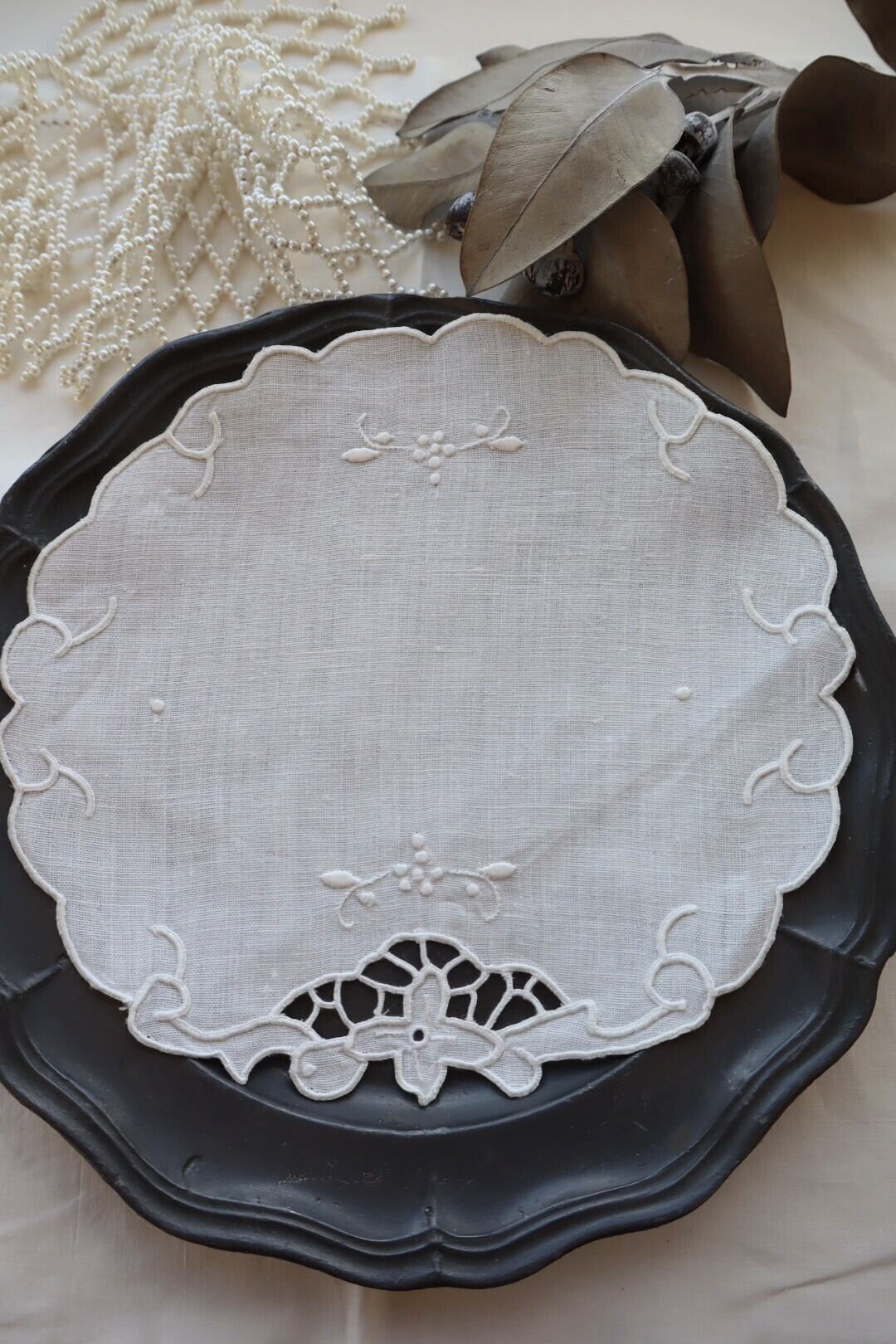 France製 19×18㎝ アンティーク刺繍ドイリー B832 ホワイト